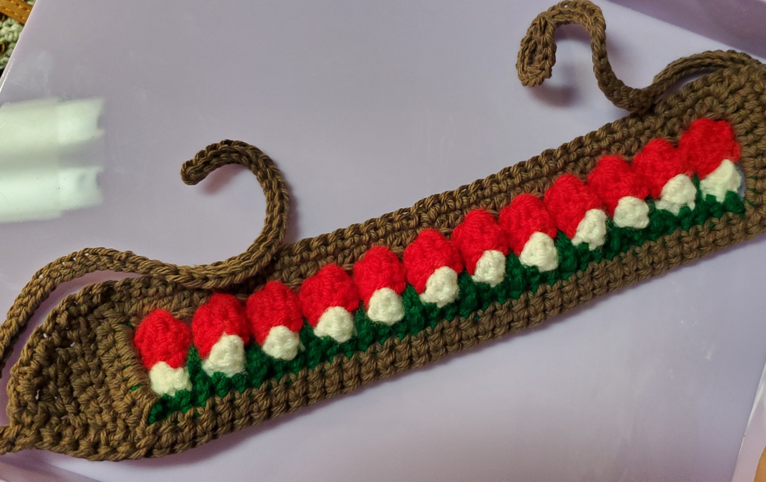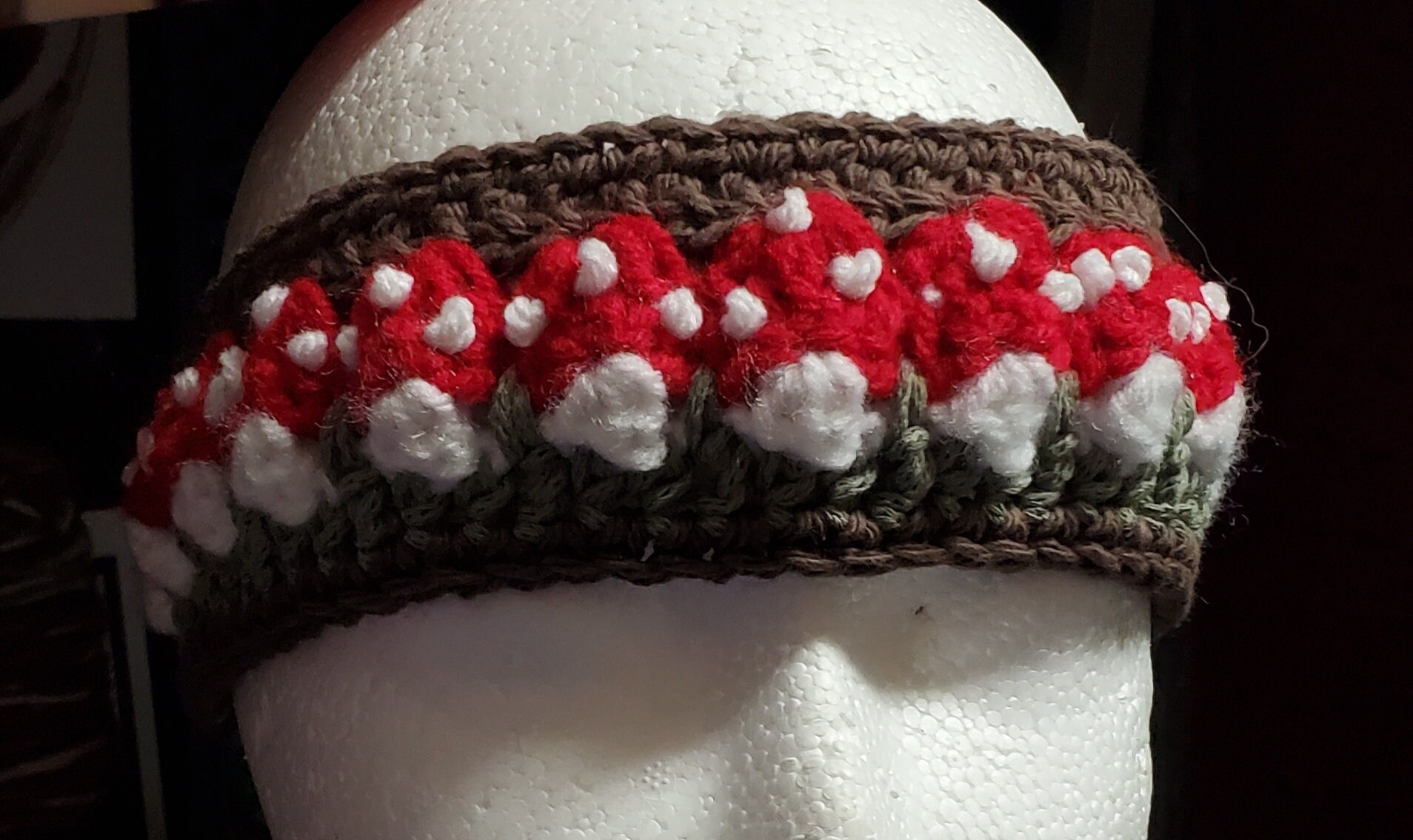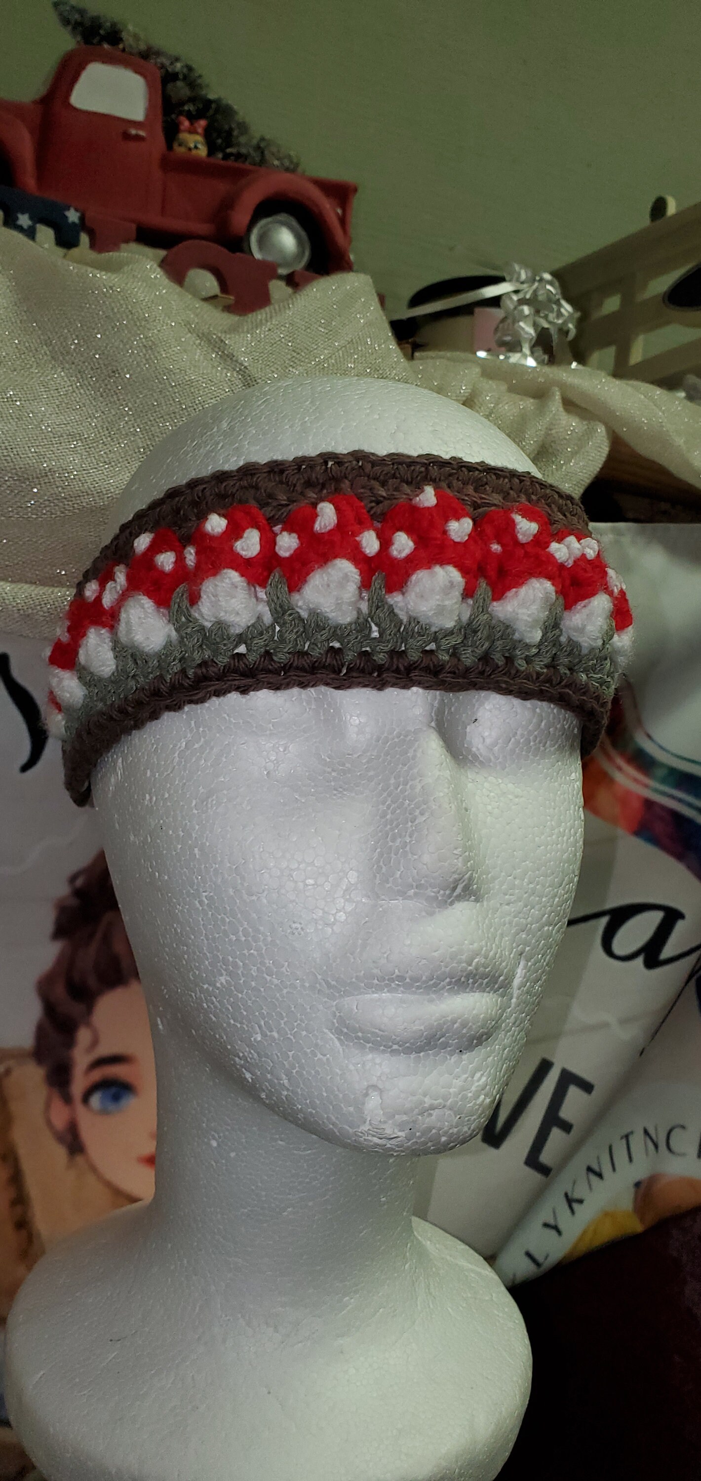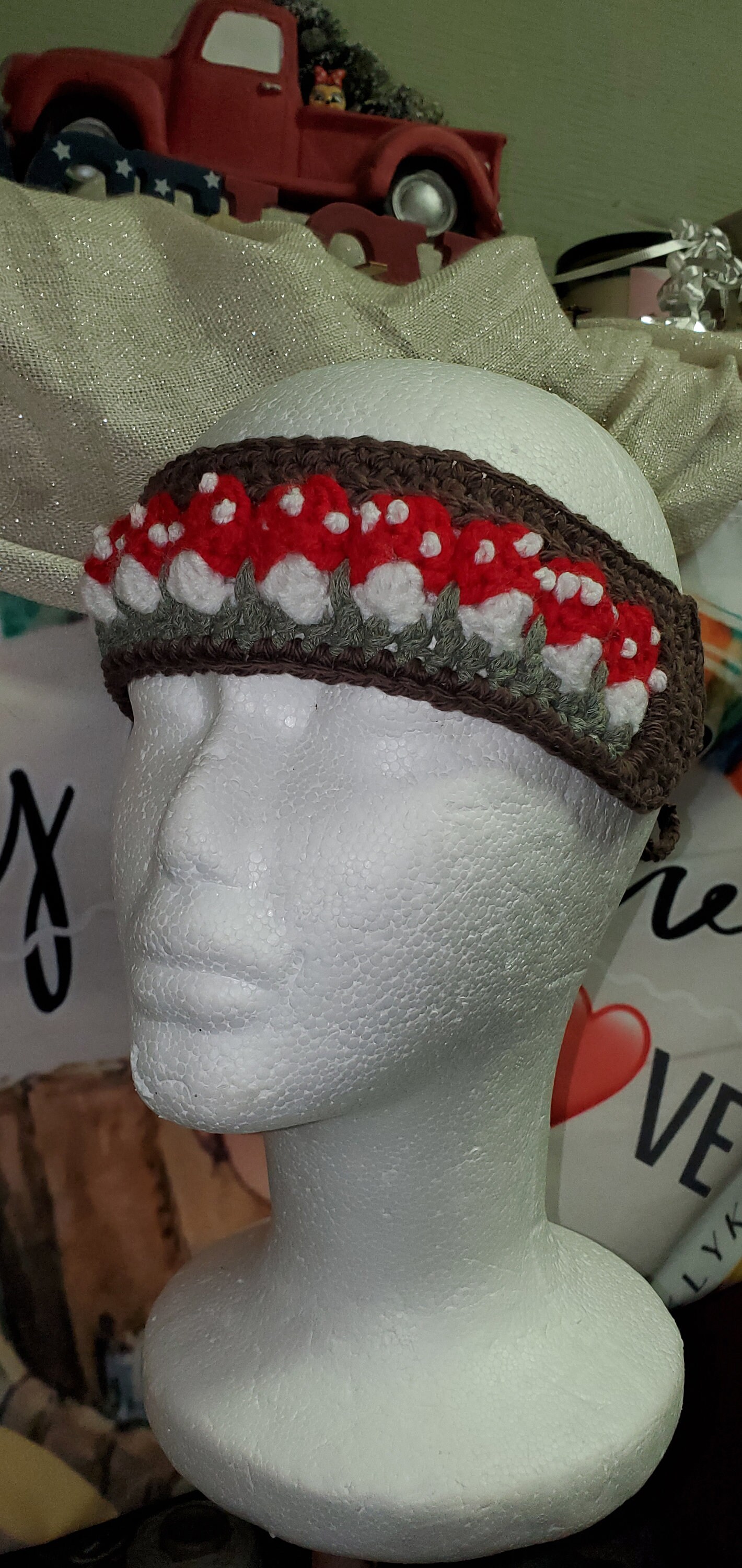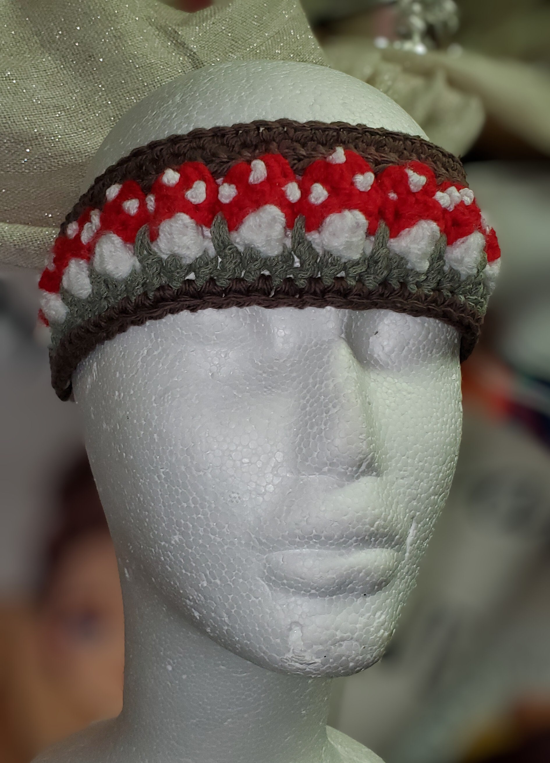 This charming crochet headband features a vibrant red mushroom design crafted from soft cotton yarn. It is the perfect whimsical accessory to add a touch of woodland magic to any outfit.