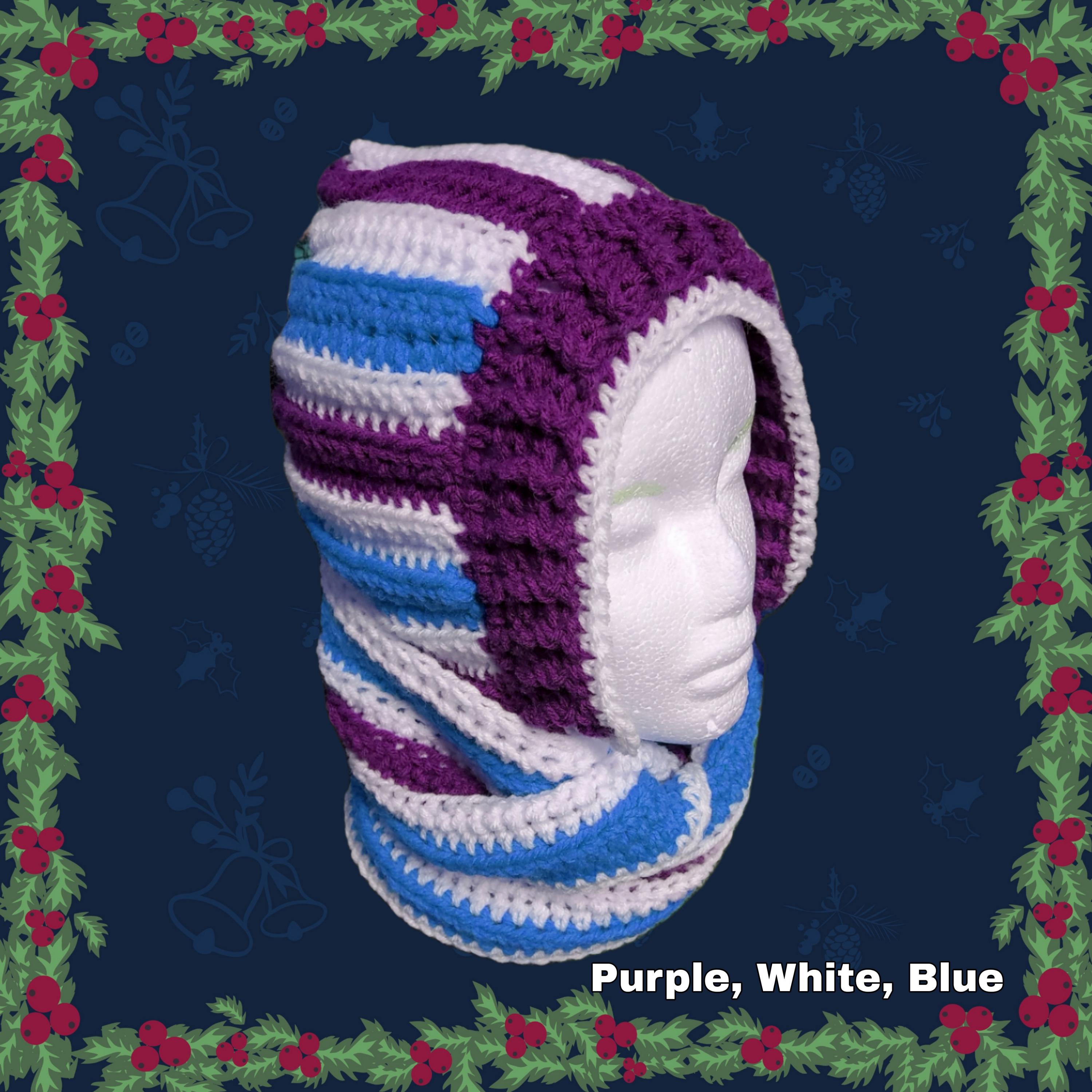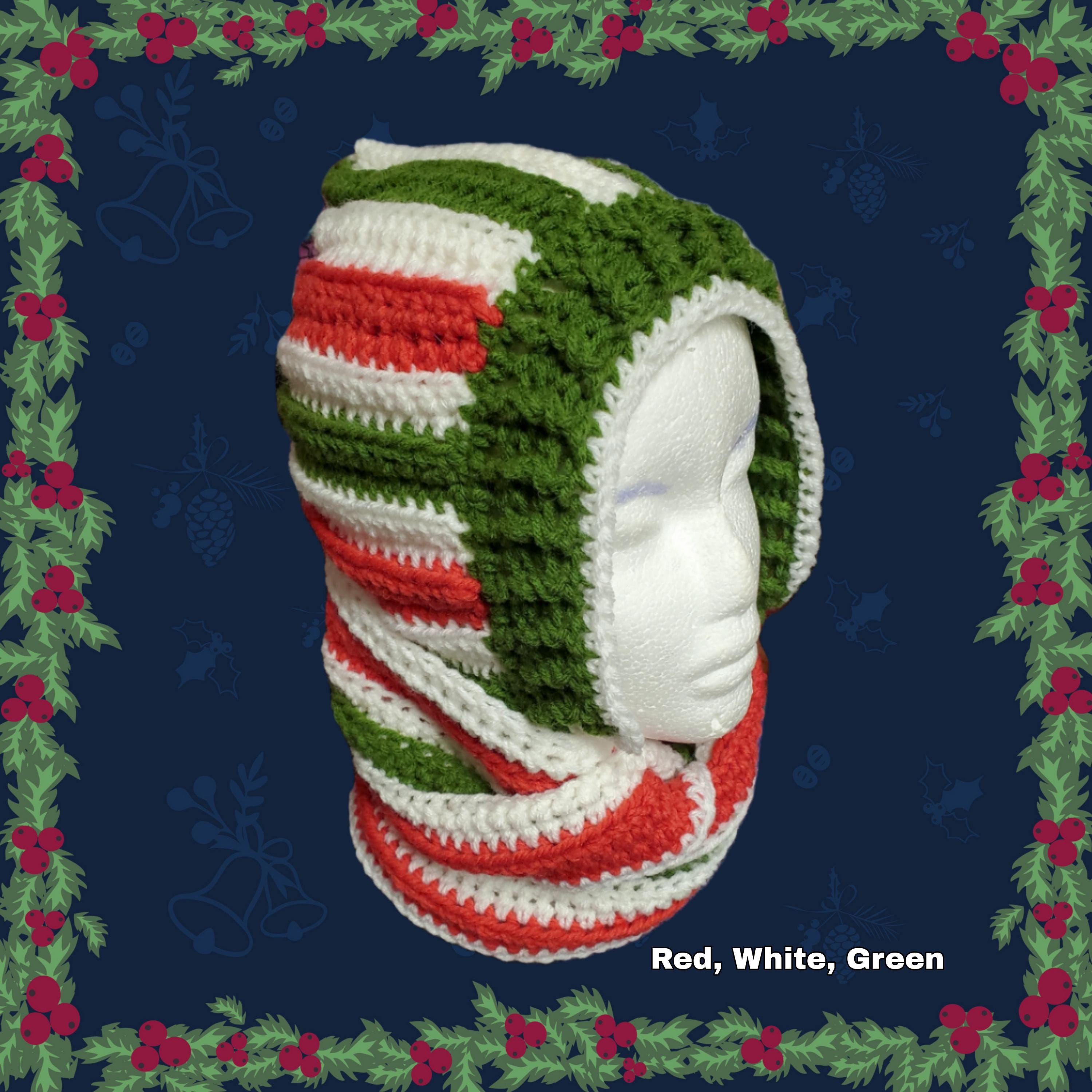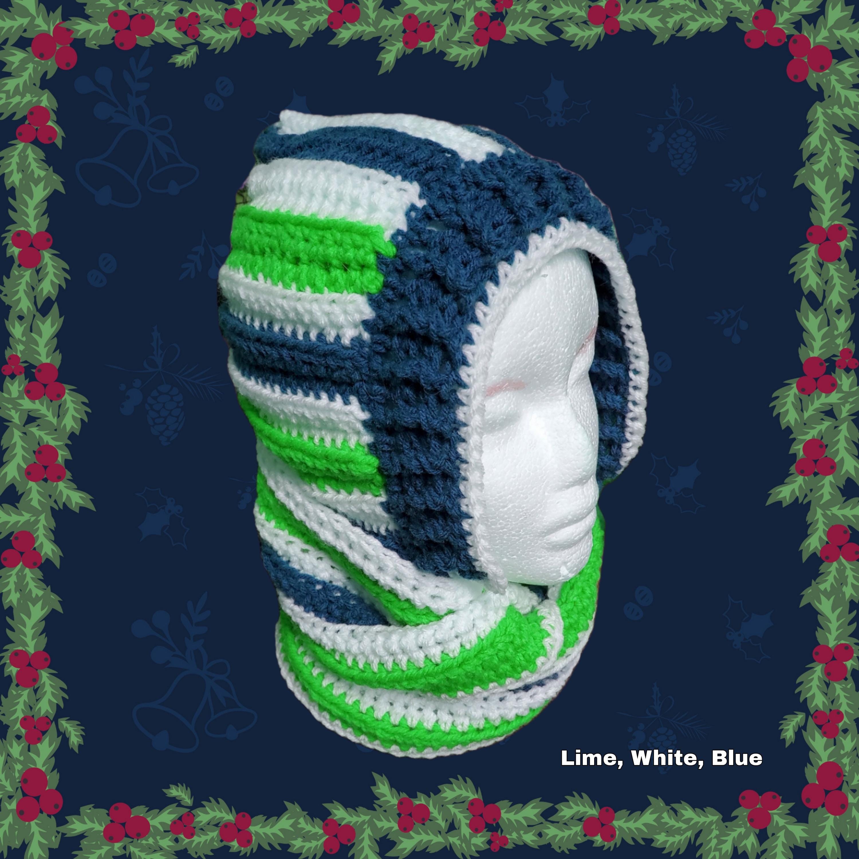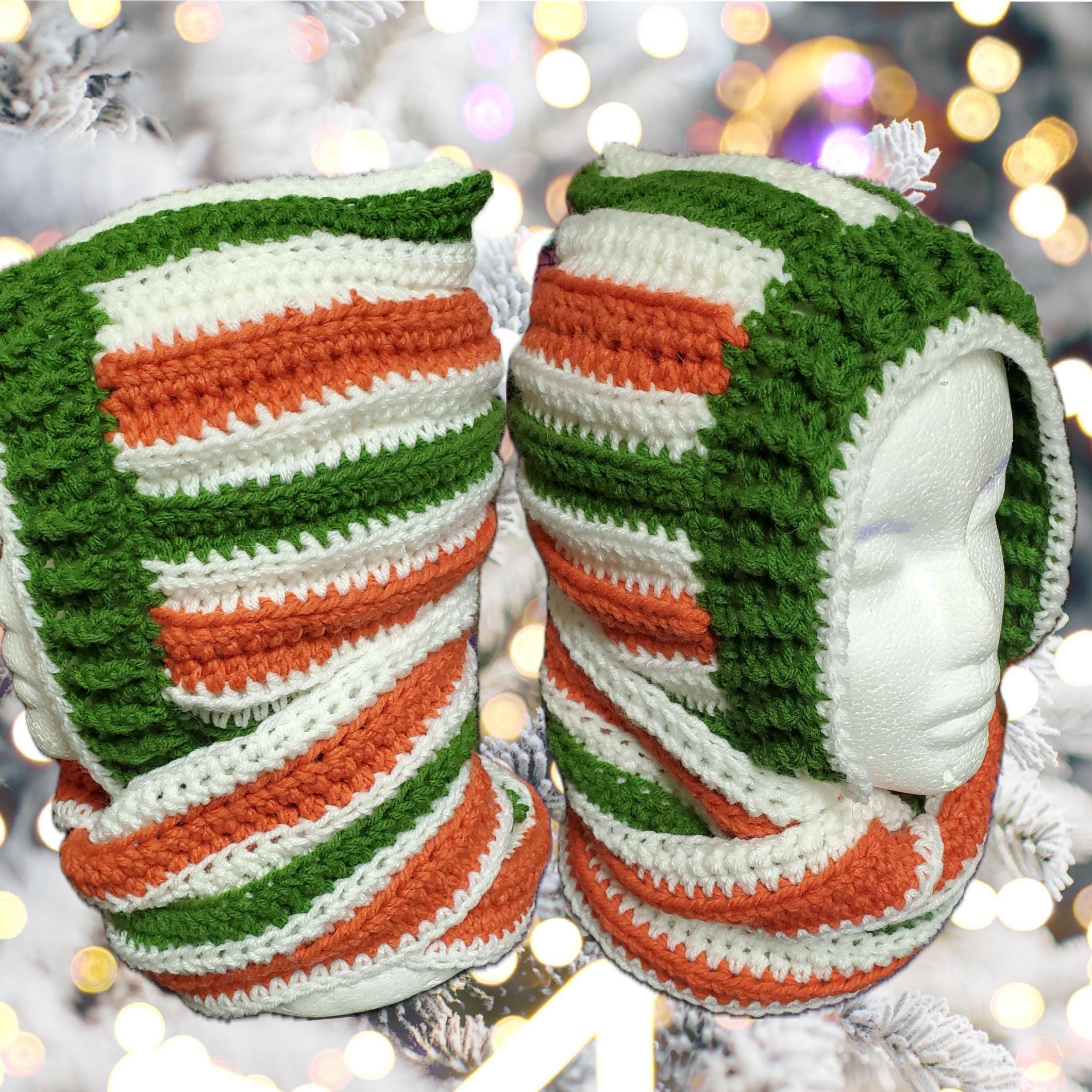 Stay cozy in this vibrant tri-color hooded scarf, meticulously handcrafted with crochet stripes of bright orange, crisp white, and deep green. This versatile accessory combines a plush hood with long, trailing scarf ends for a bold, festive look.