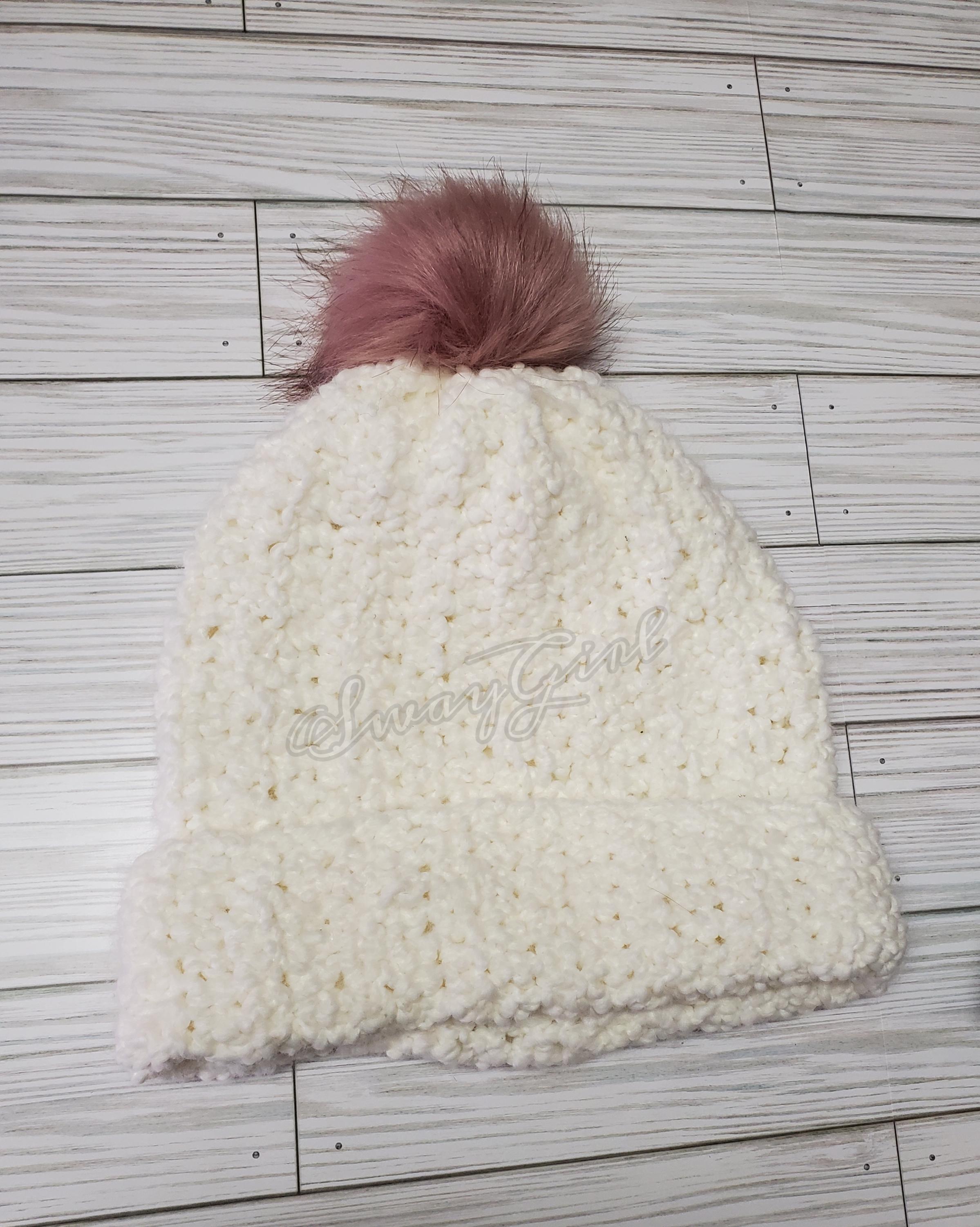 This warm, white winter ski hat is a soft and cozy way to show off your style while skiing down the mountain. Makes a wonderful gift for a loved one. Hat includes a removable pom-pom. Pom-pom is attached by a button sewn into the inside of the hat.