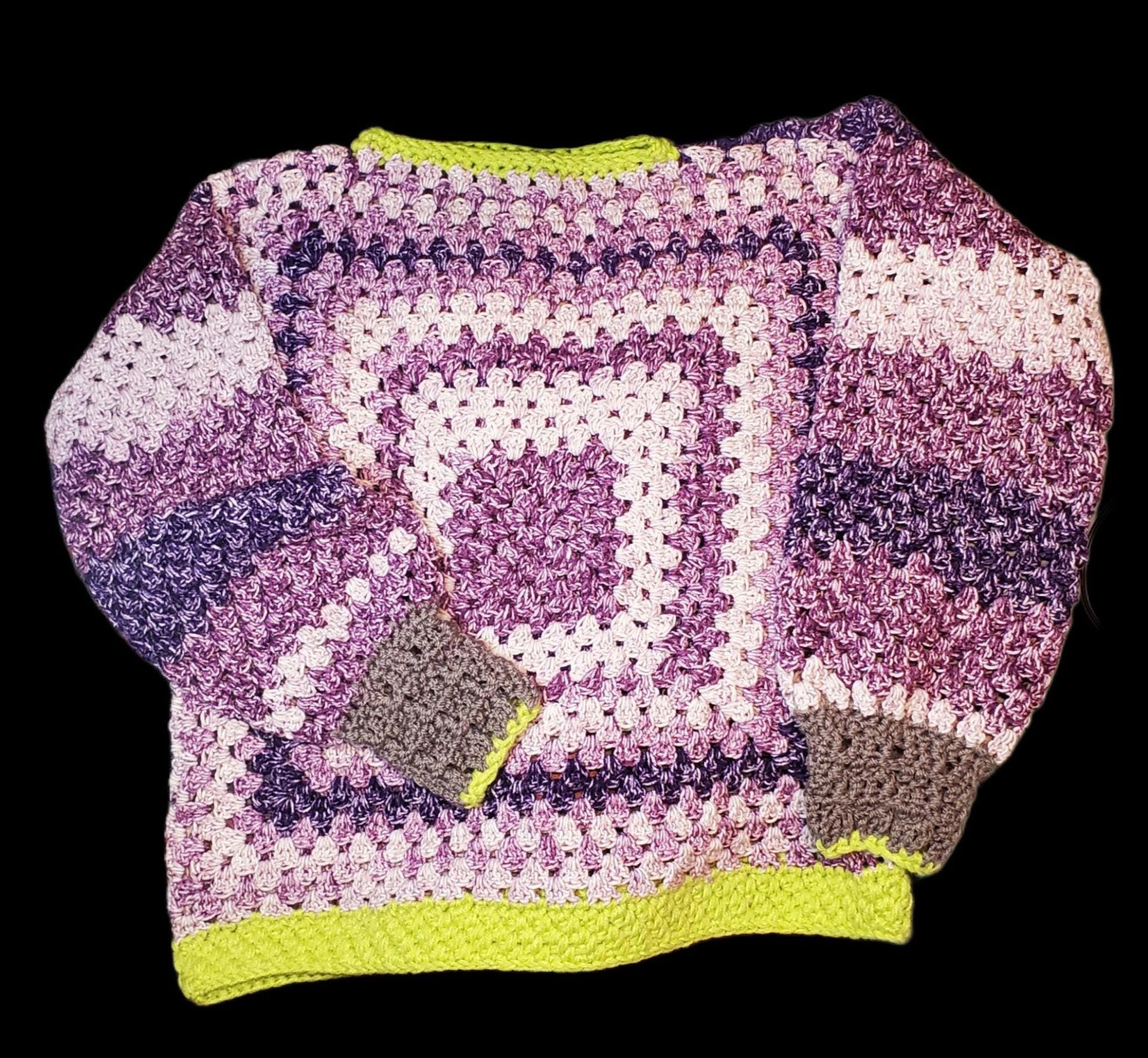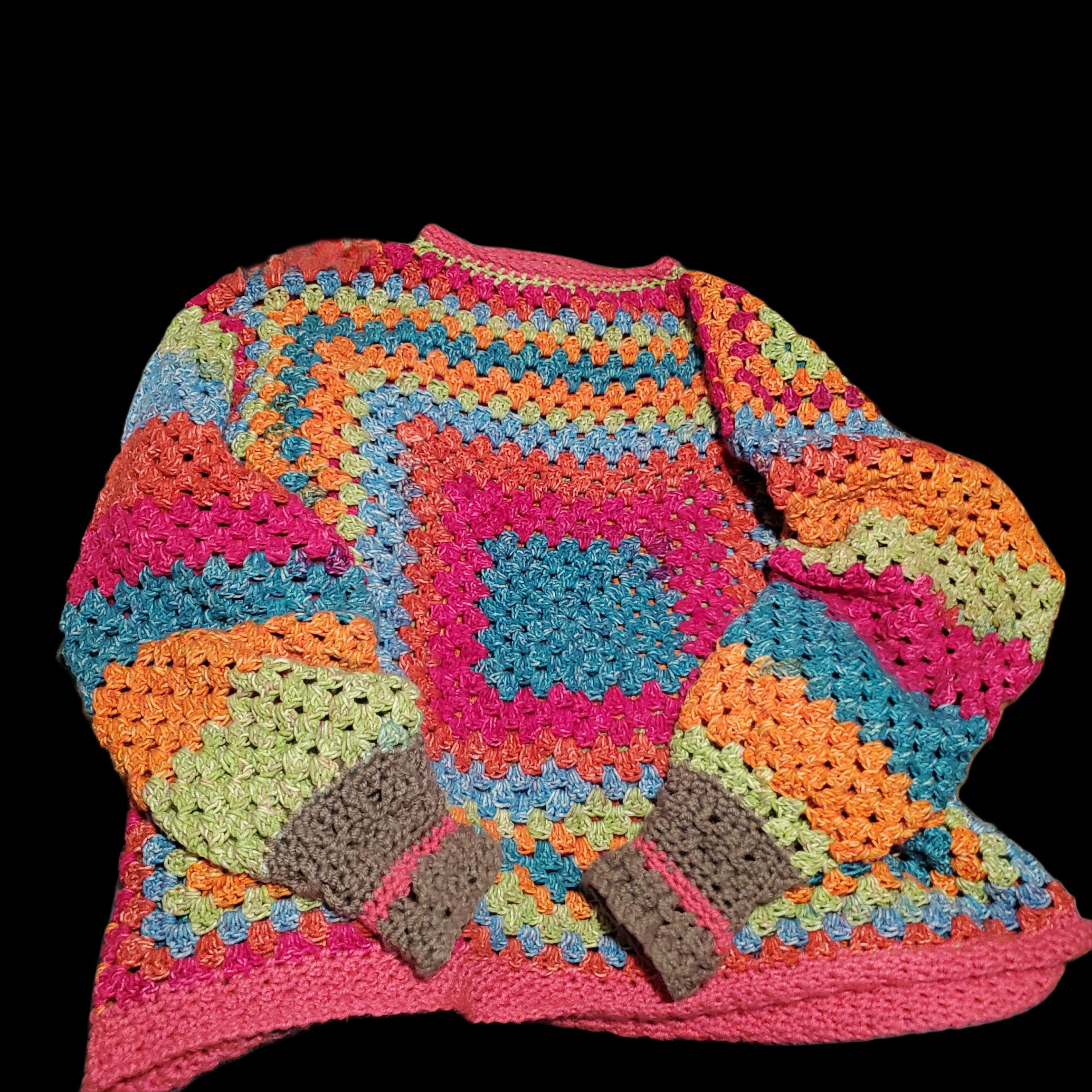 Embrace maximalist style with this vibrant, handcrafted crochet sweater. This piece puts a modern, high-energy twist on the classic granny square technique, featuring an explosion of colors like neon pinks, electric blues, sunny oranges, and lime greens just to name a few.